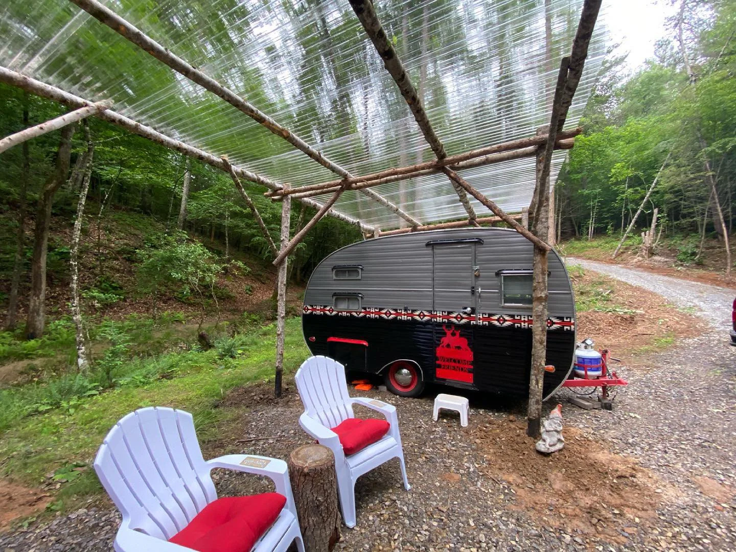 A fun, off-grid, short-term rental with a vintage “canned ham” outdoor living space including a creekside composting toilet and shower.